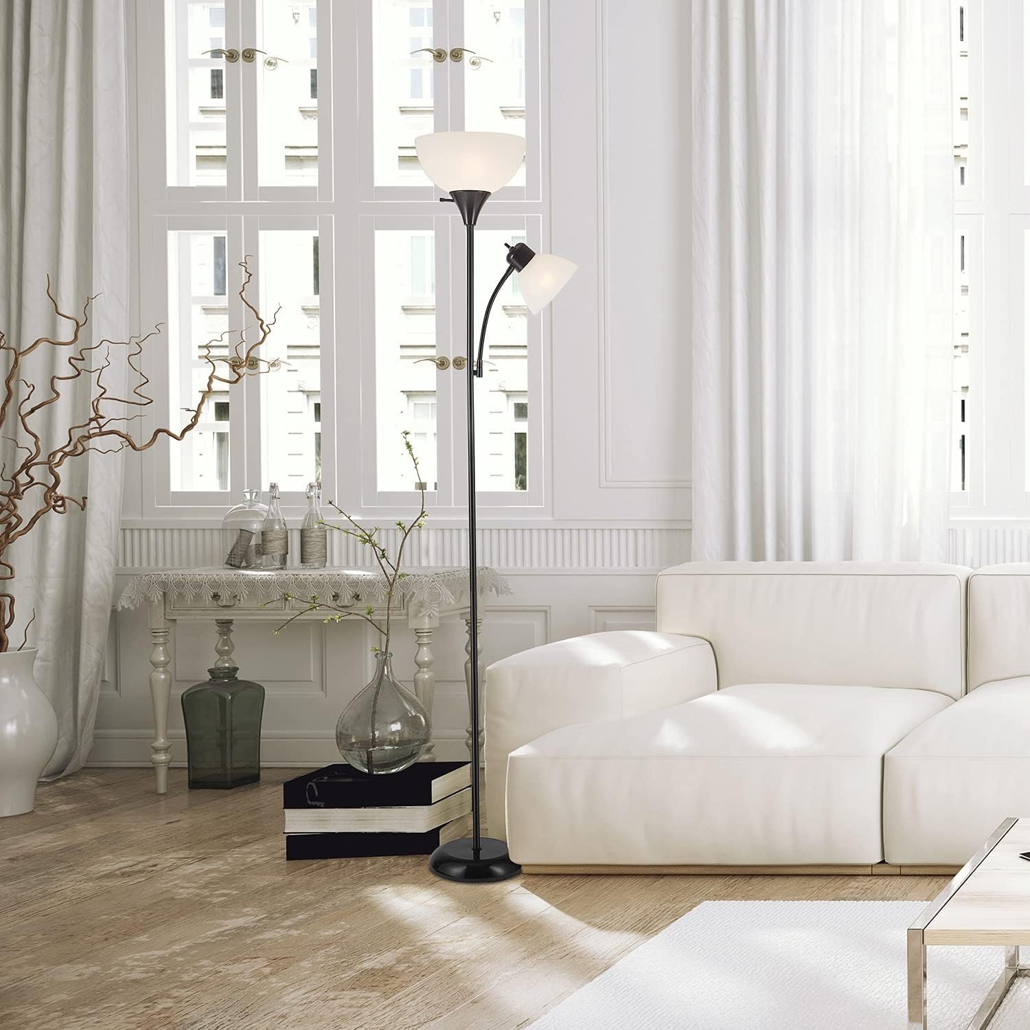 This versatile floor lamp features a dual-light design, combining a powerful torchiere for ambient lighting with an adjustable reading light for focused tasks. The flexible gooseneck allows you to direct light exactly where you need it, making it ideal for reading, working, or relaxing.